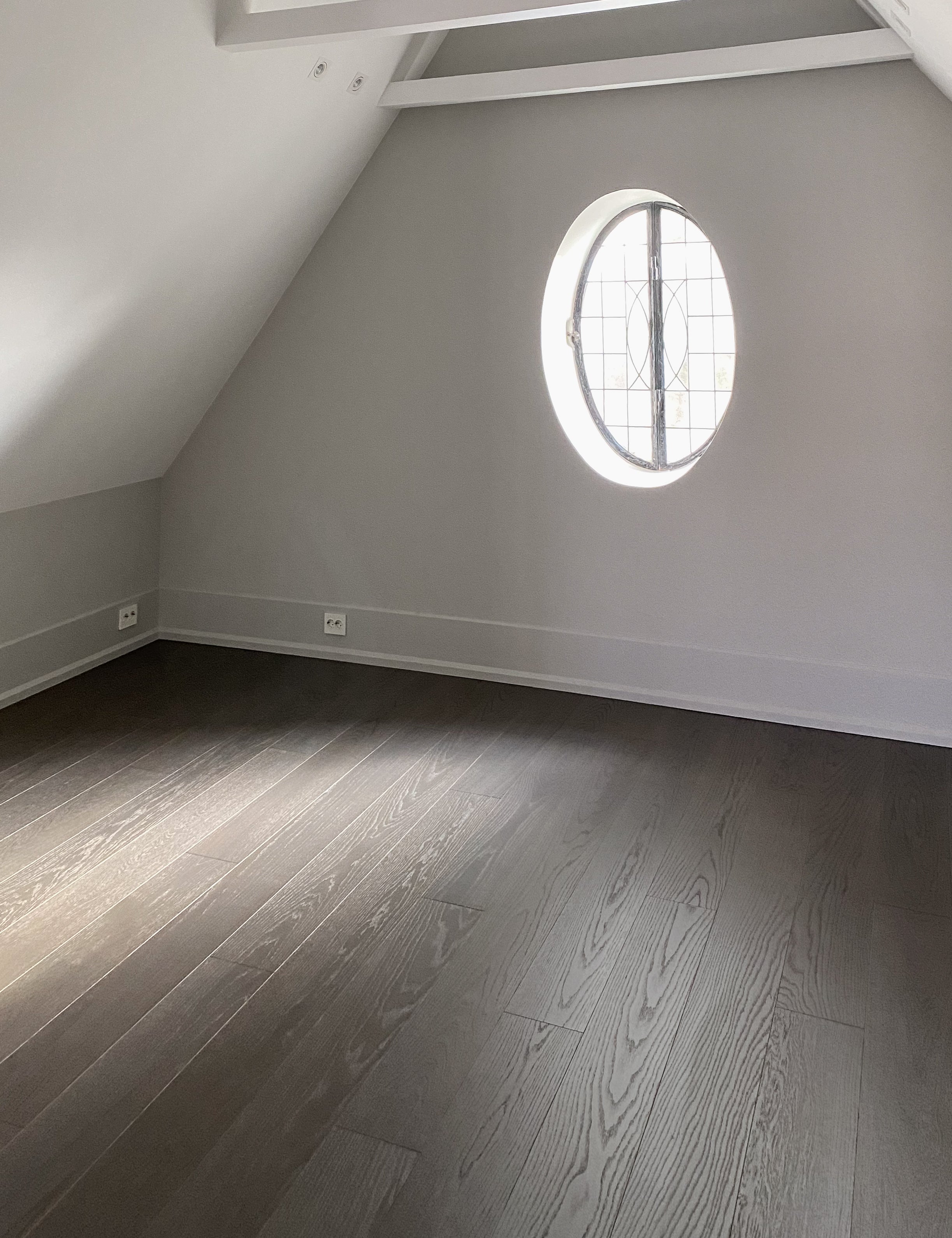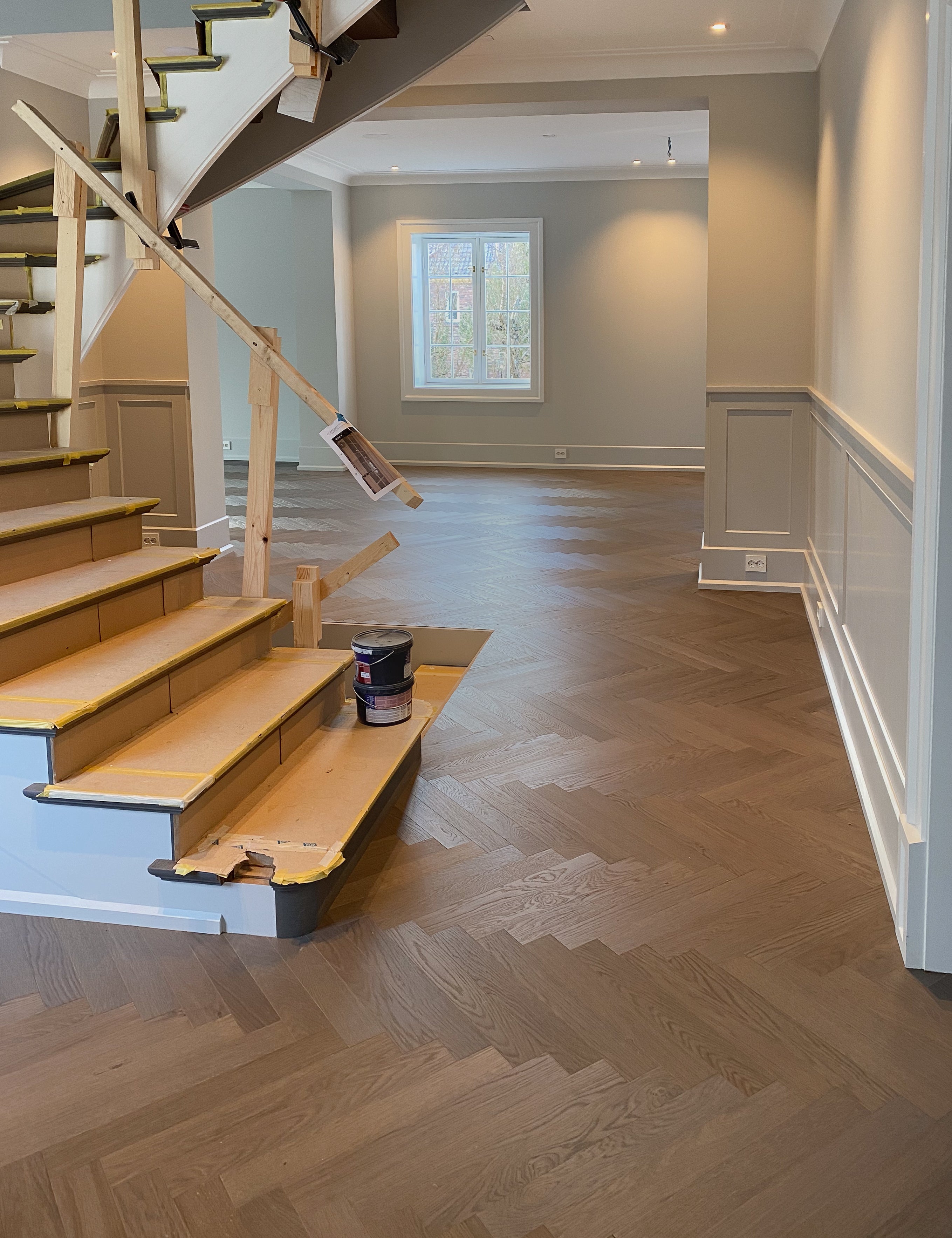 I over- og underetasjen ble det brukt enstavs planker, mens hovedetasjen fikk et klassisk fiskebensmønster. Alle terskler og overganger ble slipt og farget for en sømløs og harmonisk finish.