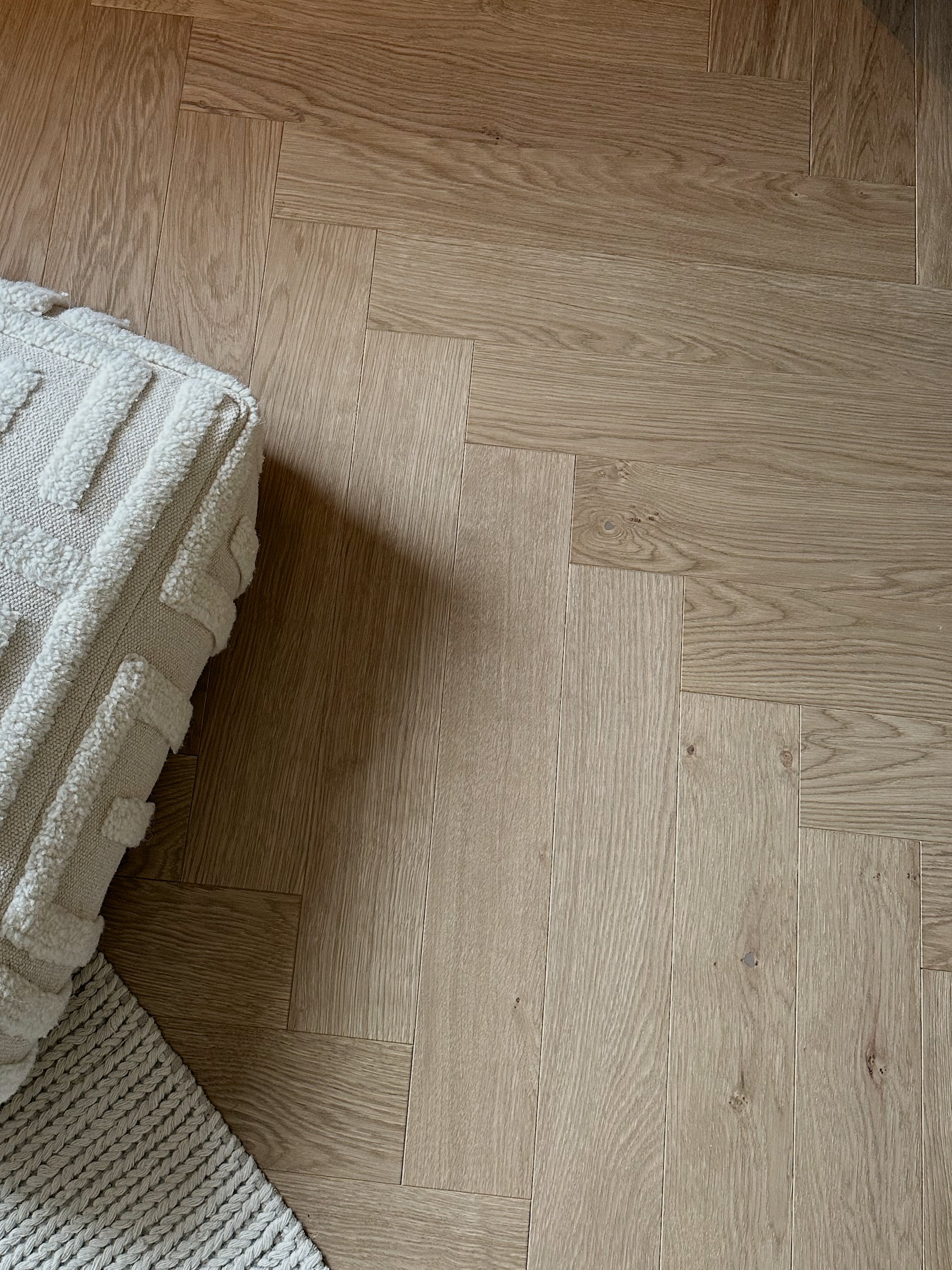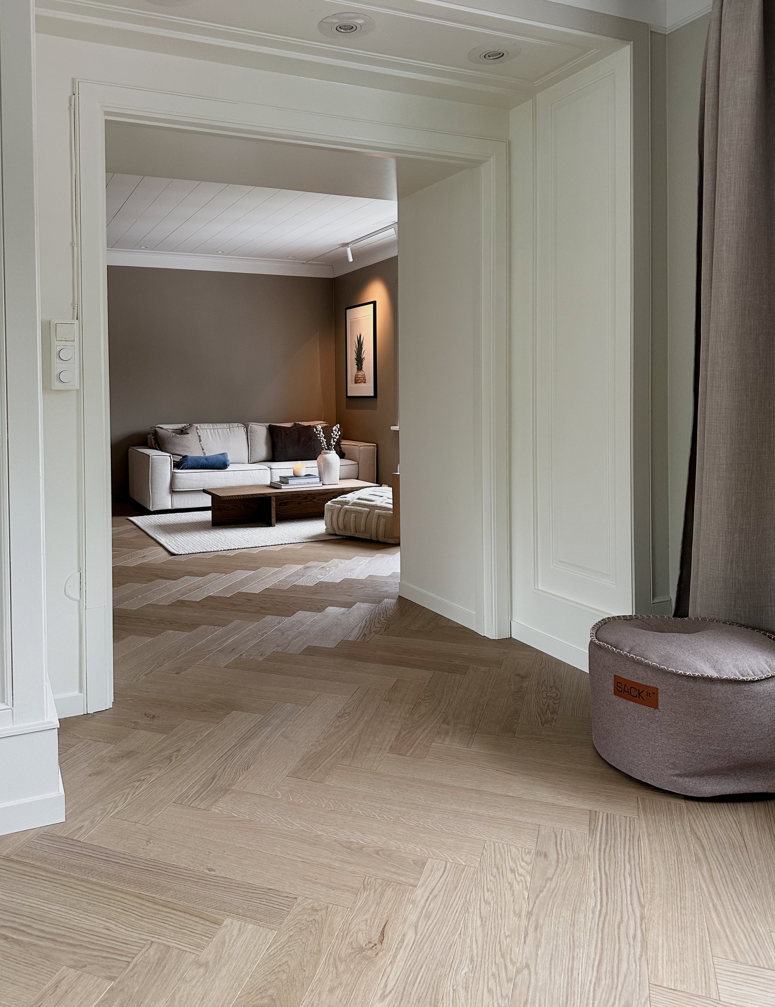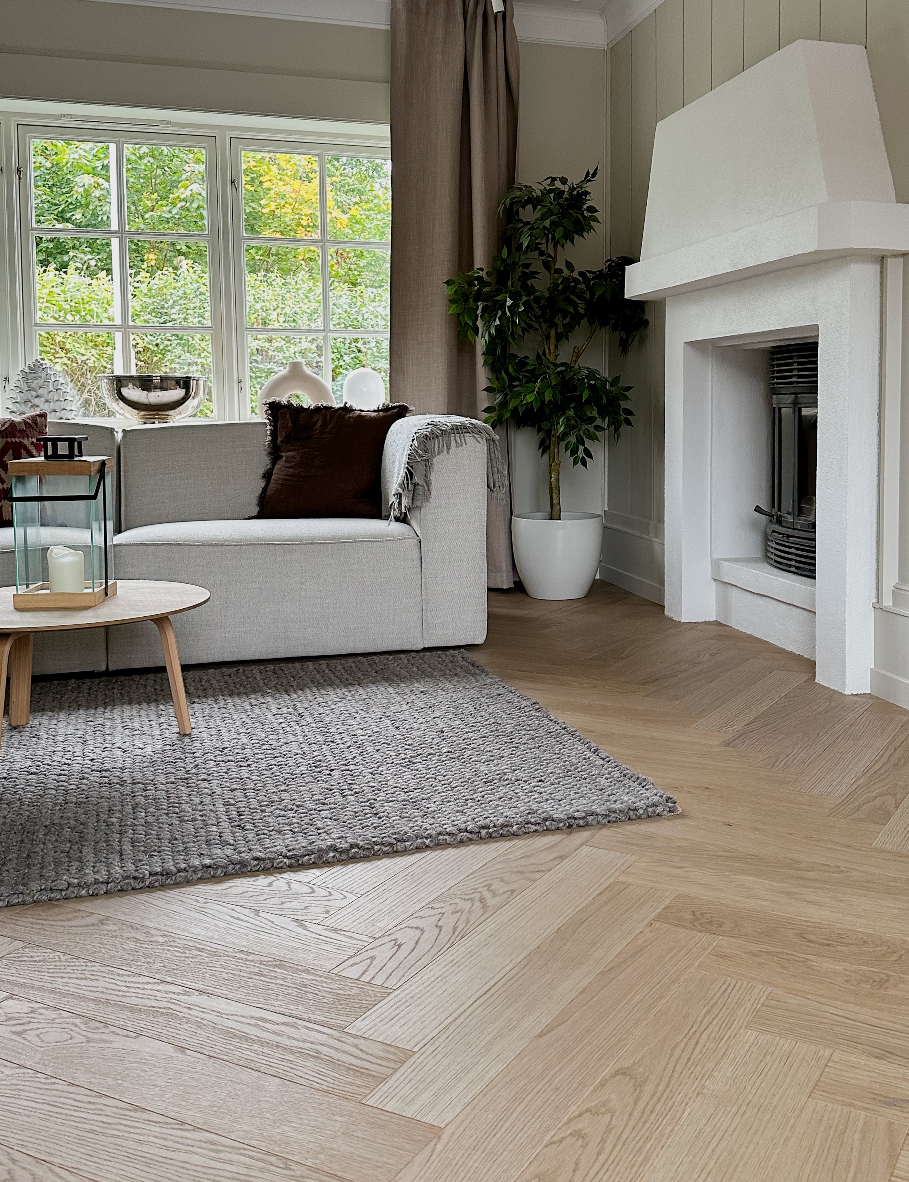 Eierne av dette vakre murhuset ble inspirert av dansk interiørstil etter mange år i København. Hjemmet er utstyrt med et klassisk fiskebeinsgulv i eik, i en av våre mest populære farger – Moonstone. De dempede tonene i Moonstone forsterker den nordiske stilen og skaper en følelse av hygge.