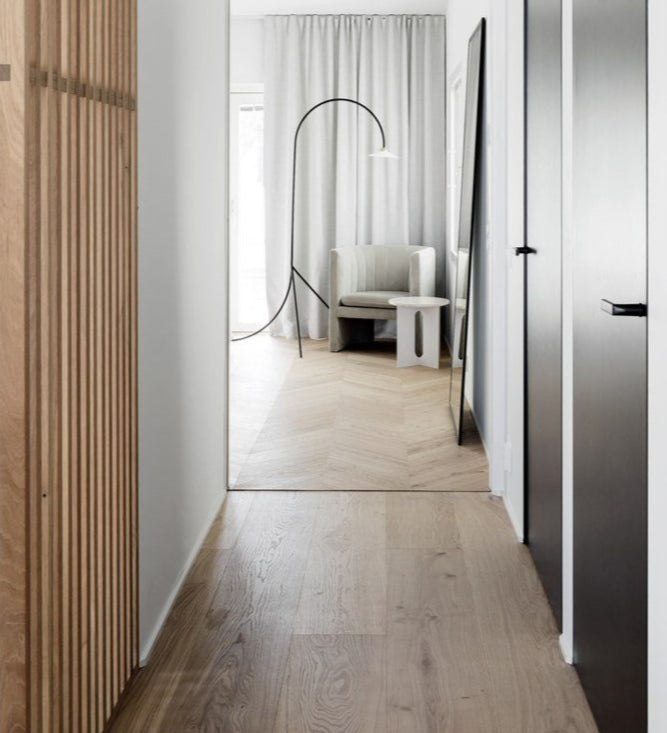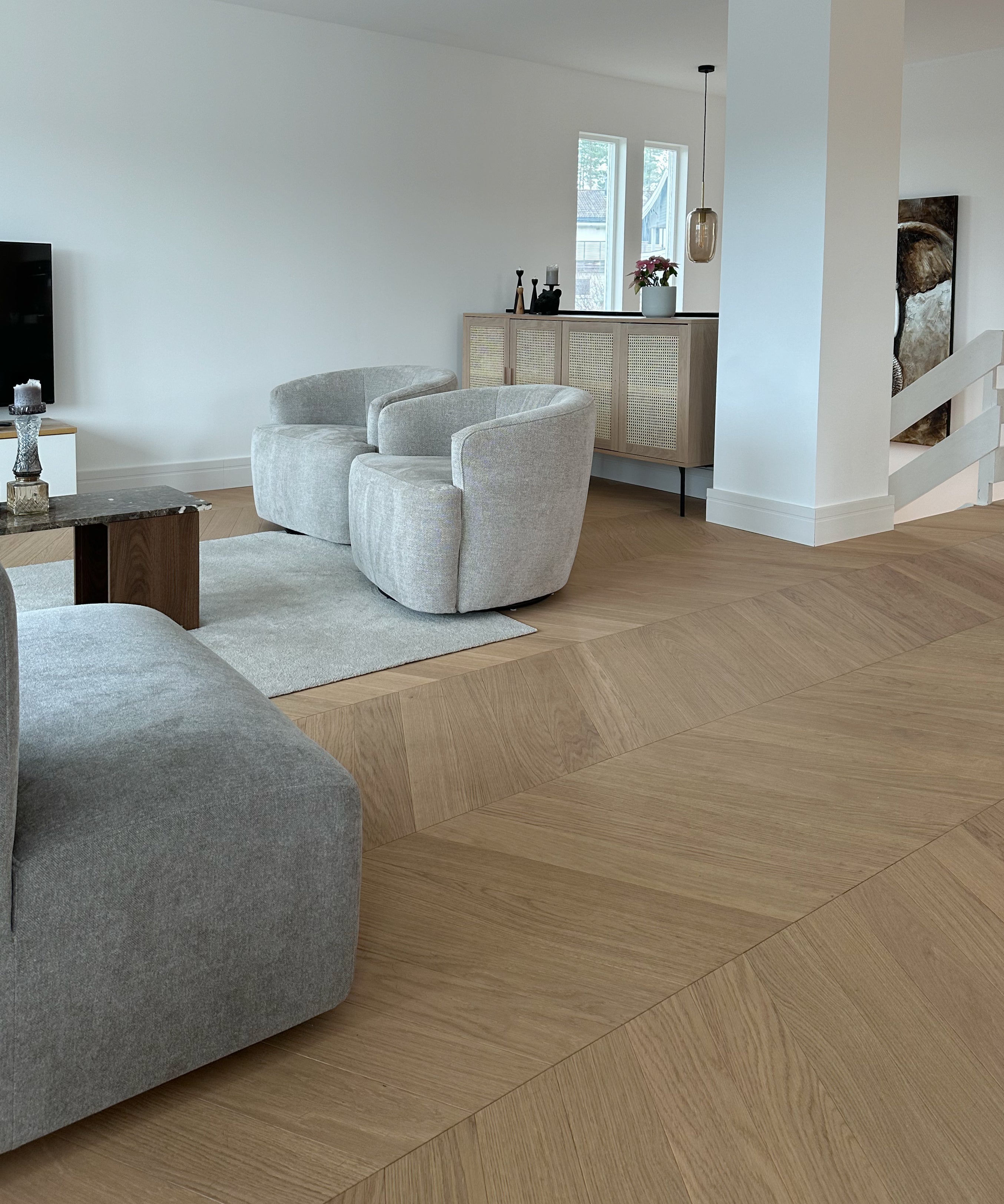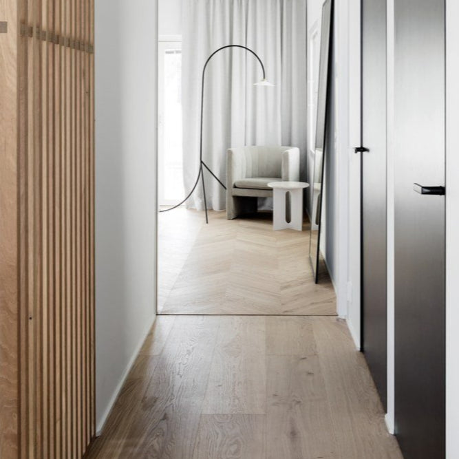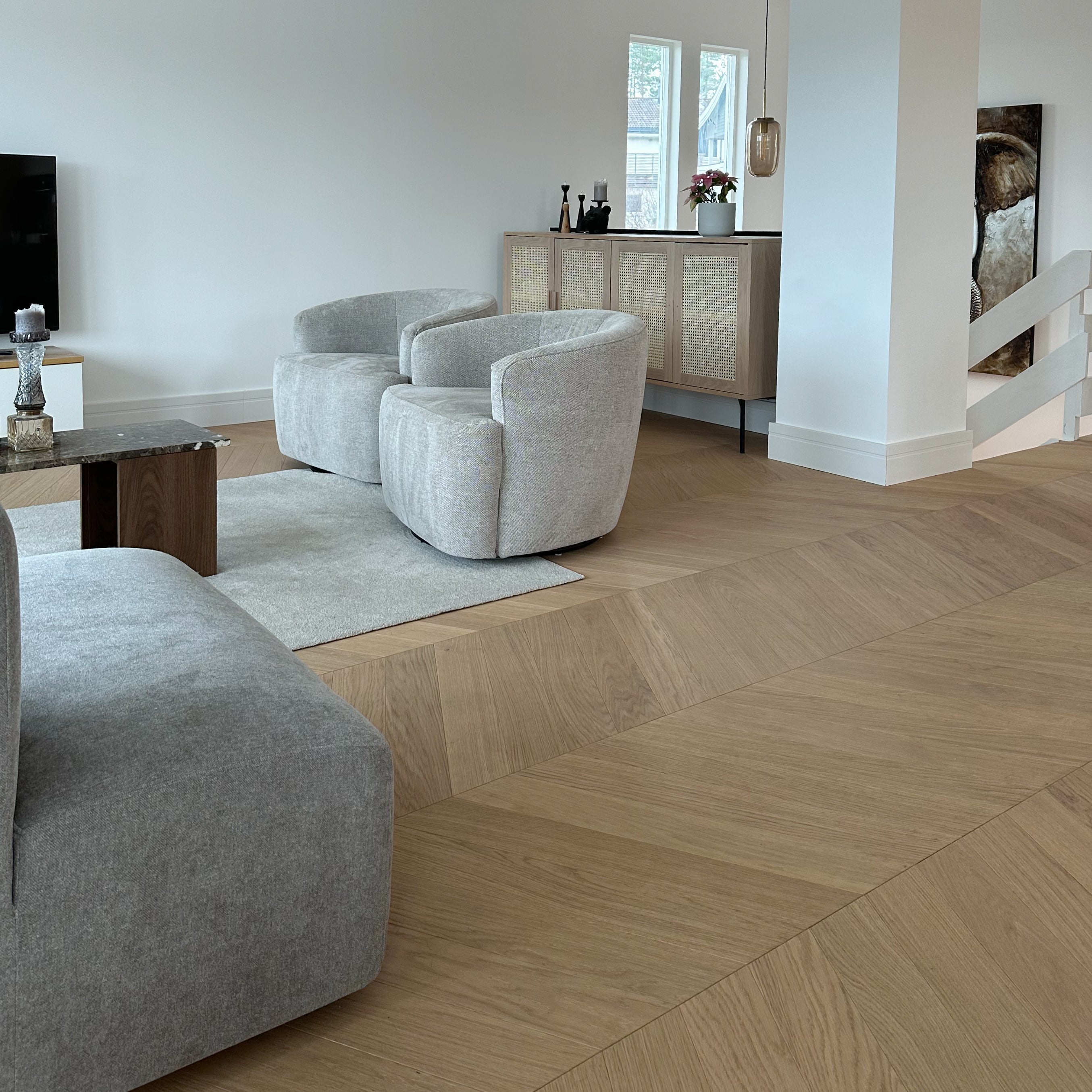 Enstavs eik består av én hel stav per bord, noe som gir et roligere og mer eksklusivt uttrykk enn flerstavs parkett. Gulvet fremhever treets naturlige struktur og gir rommet et mer helhetlig og tidløst preg.