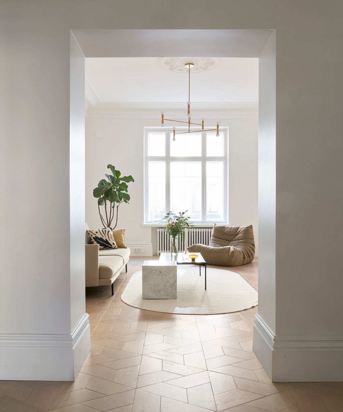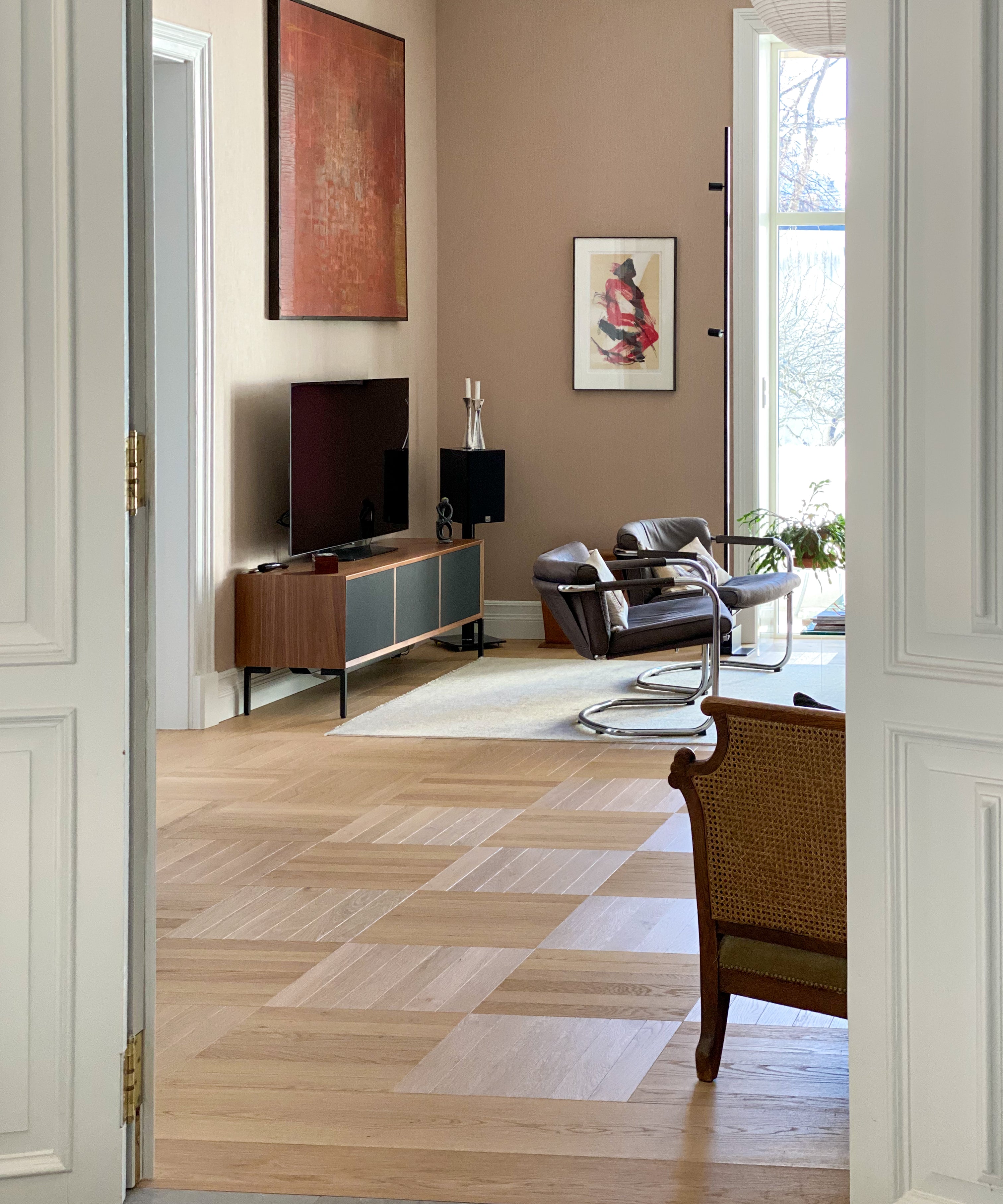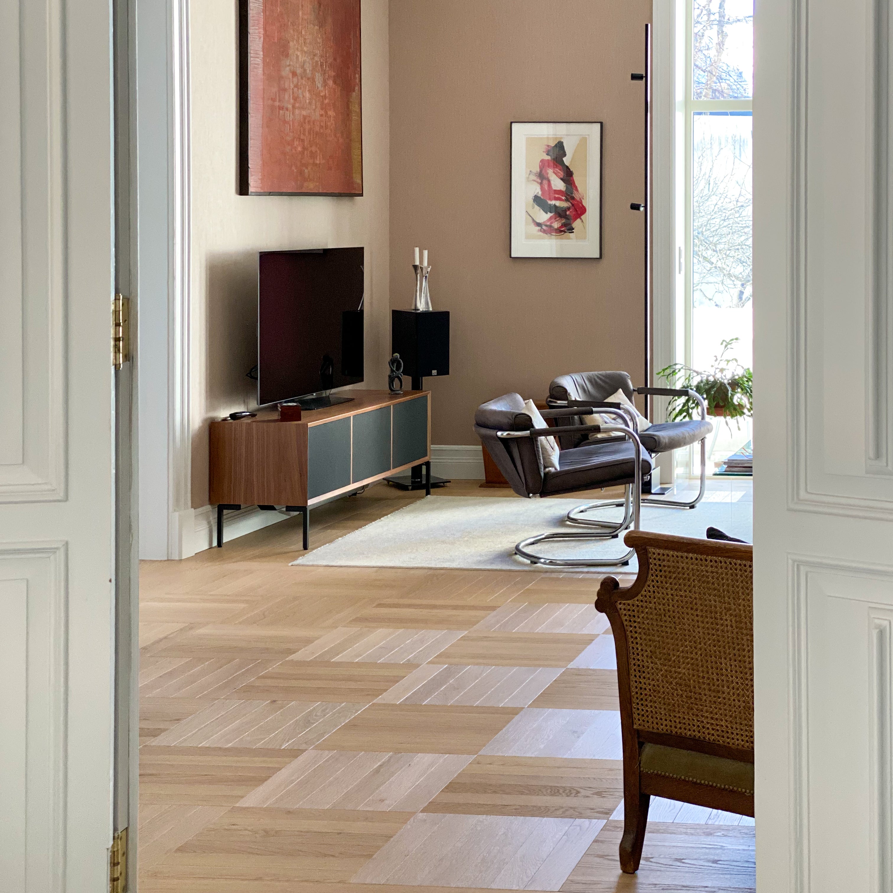 Enstavs eik består av én hel stav per bord, noe som gir et roligere og mer eksklusivt uttrykk enn flerstavs parkett. Gulvet fremhever treets naturlige struktur og gir rommet et mer helhetlig og tidløst preg.