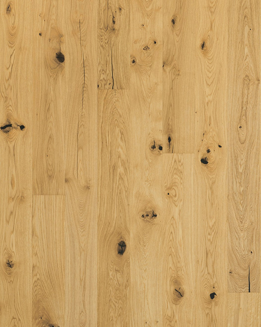 Markante kvister og sprekker. Gir en autentisk og levende overflate med treets fulle karakter.