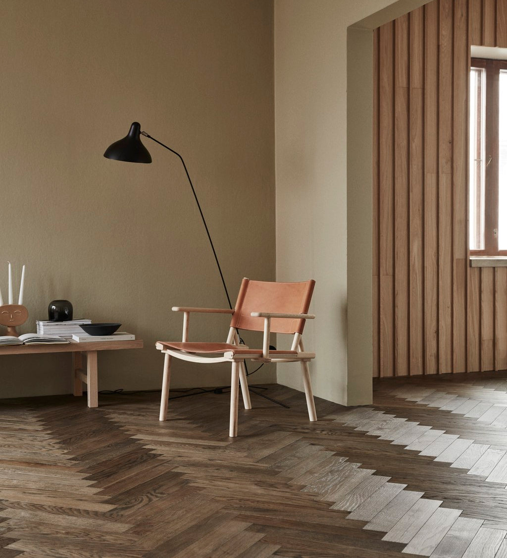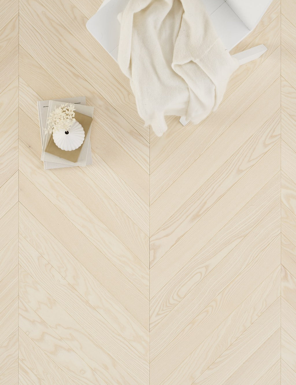 Chevron er et symmetrisk design som kombinerer moderne stil med klassisk eleganse. Den finnes i tre størrelser og kan leveres med enten 45° eller 60° vinkel. Velg mellom eik eller ask i flere farger. Chevron har bjørkefinér i midtsjiktet og mikrofas på alle kanter. Parketten monteres med lim direkte på undergulvet. Velegnet for gulvvarme.