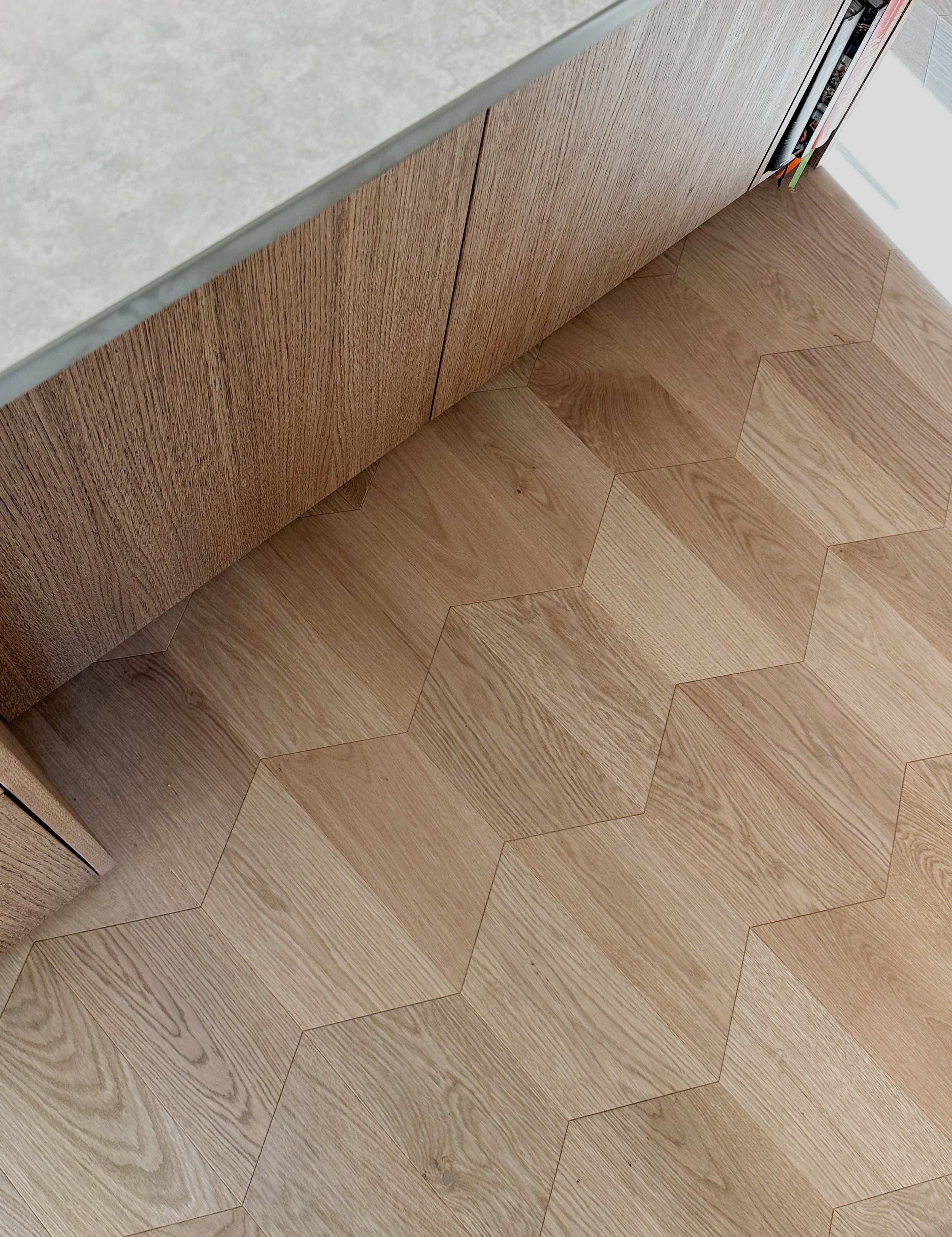Kolmio-mønsteret ble skapt med ideen om å utnytte hele råvaren. Delene til mønsteret lages av overskuddsmaterialer fra produksjonen av ubehandlede planker. Hexagon er laget av Kolmio-deler. Mønstrene finnes i eik og ask, og leveres i classic-sorteringen. Velg mellom flere farger. Parketten monteres med lim direkte på undergulvet. Velegnet for gulvvarme.