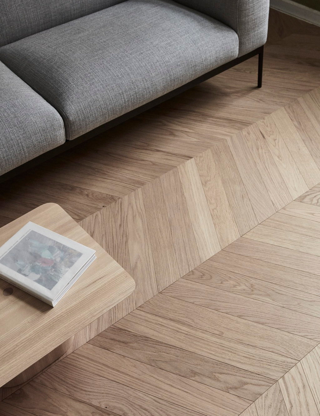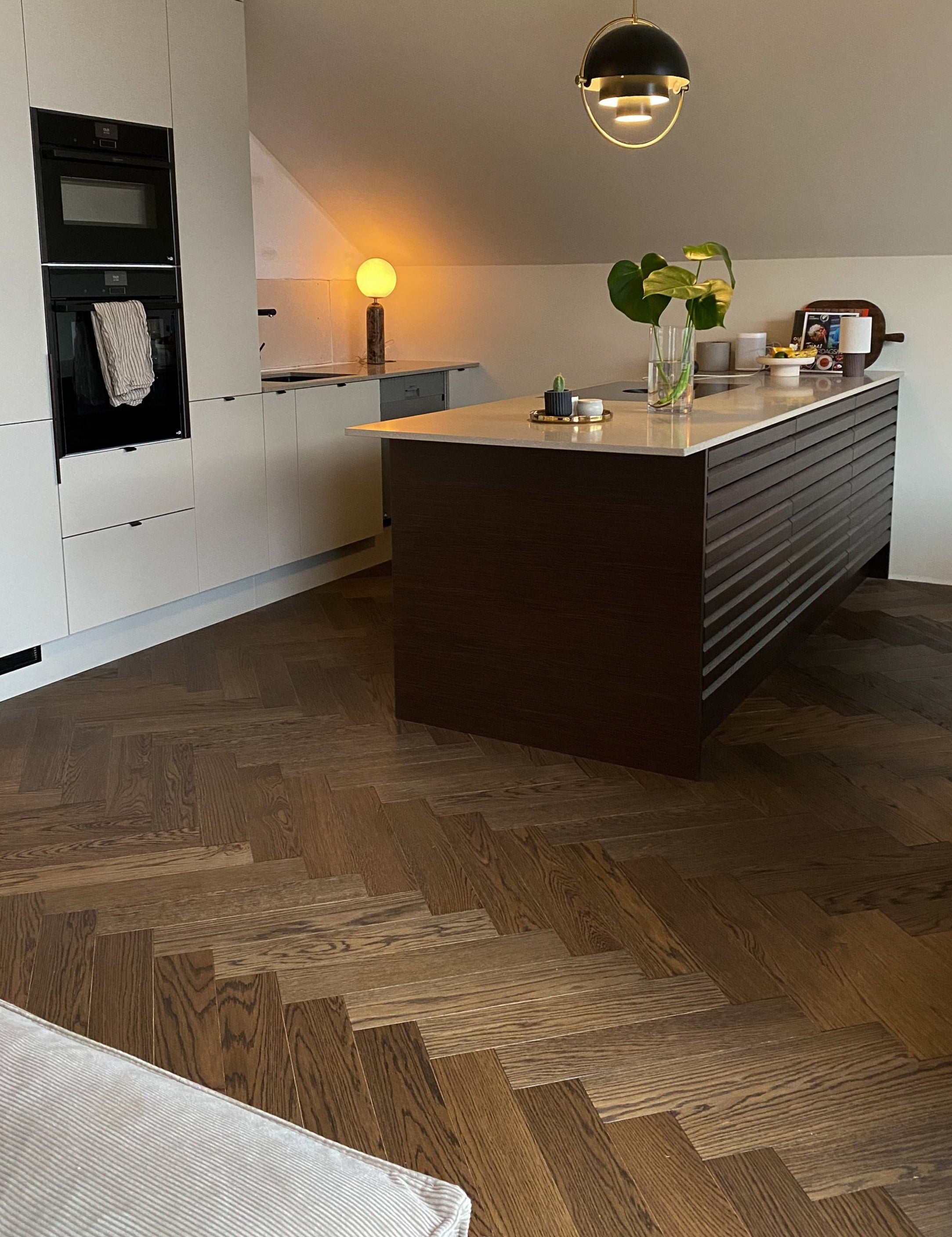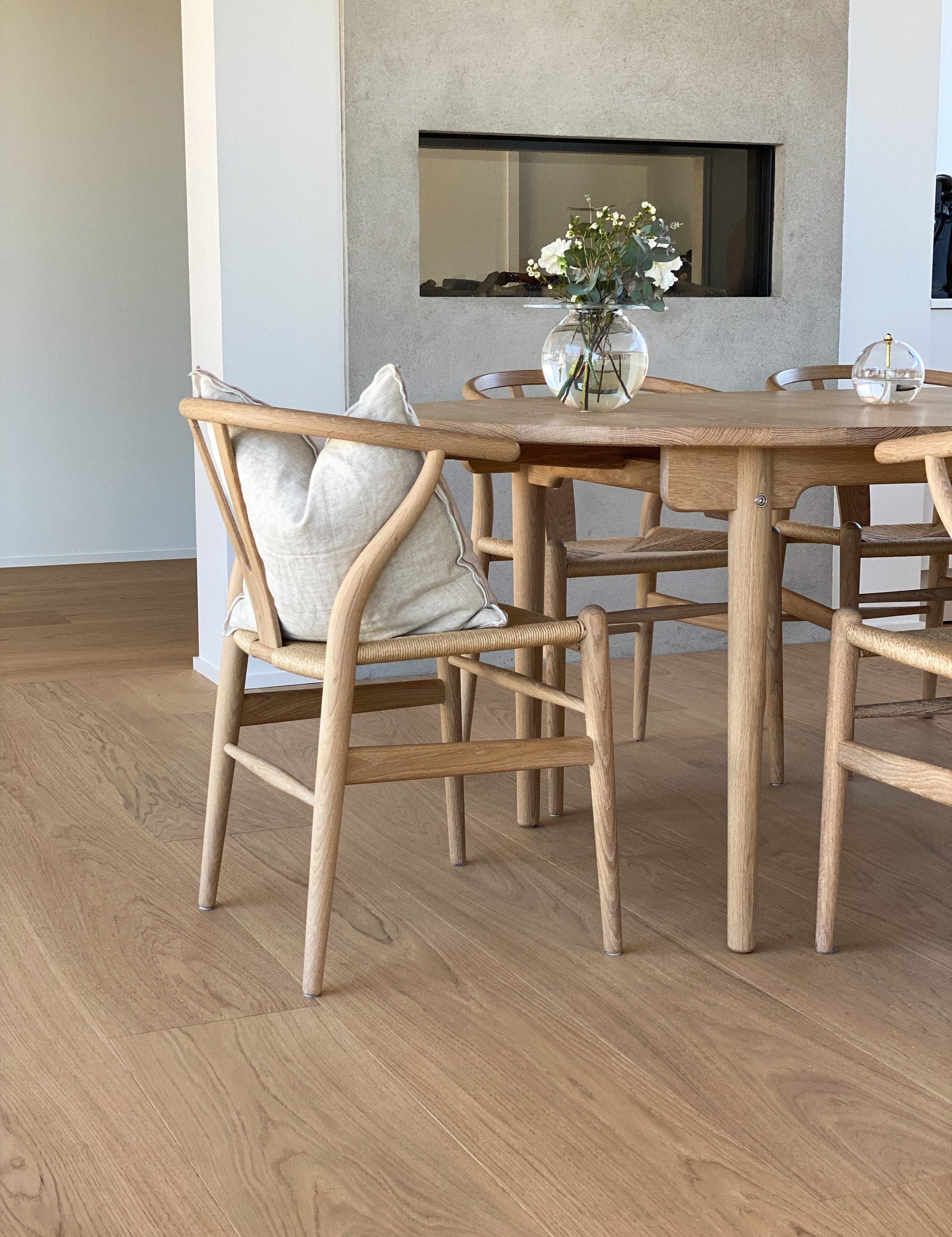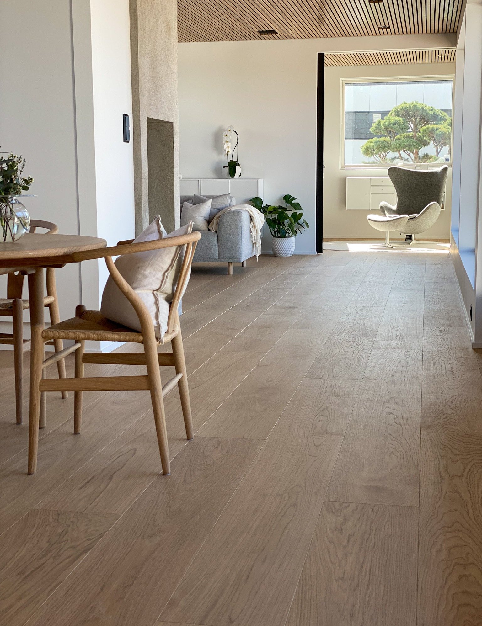 Enstavs eik består av én hel stav per bord, noe som gir et roligere og mer eksklusivt uttrykk enn flerstavs parkett. Gulvet fremhever treets naturlige struktur og gir rommet et mer helhetlig og tidløst preg.